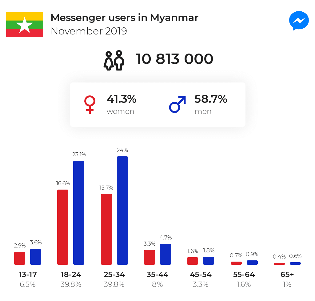 ၂၀၁၉ နိုဝင်ဘာလအထိ ရထားတဲ့ ကိန်းဂဏာန်းအရ မြန်မာနိုင်ငံမှာ Messenger အသုံးပြုသူ စုစုပေါင်း 10 813 000 ယောက်ရှိနေပြီး ဒါဟာ တစ်နိုင်ငံလုံးက လူဦးရေရဲ့ 19.7% ဖြစ်ပါတယ်။ Messenger အသုံးပြုတဲ့ မြန်မာနိုင်ငံသားအများစုကတော့ ယောကျာ်းလေးတွေပါ။ စုစုပေါင်း 58.7% ရှိပါတယ်။ အသက် 25 ကနေ 34 အတွင်း ရှိတဲ့ လူဦးရေ (4 300 000)လောက်က Messenger ကို အများဆုံး အသုံးပြုကြပါတယ်။